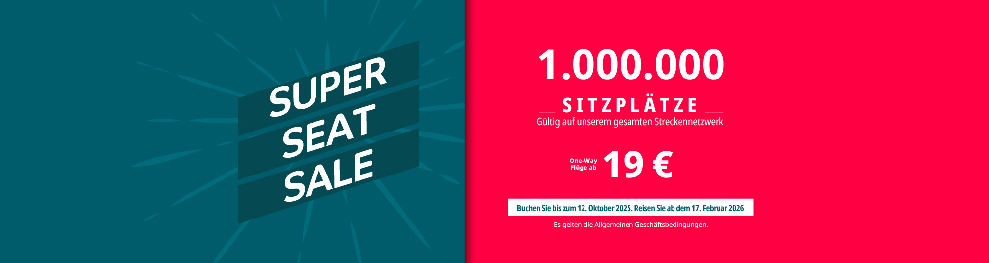 Der Super Seat Sale ist zurück mit 1 Million Sitzplätzen in unserem gesamten Streckennetz. One-Way Flüge bereits ab 93 EUR verfügbar. Buchen Sie jetzt und sichern Sie sich dieses Angebot.