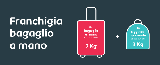 - 1 bagaglio a mano: max 55 × 40 × 20 cm (fino a 7 kg).