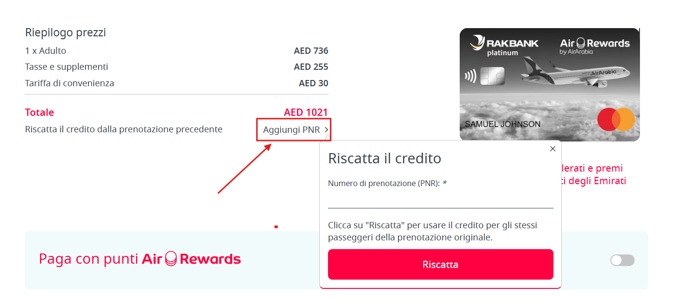 - Nella pagina di pagamento, seleziona Aggiungi PNR nella sezione sottostante per riscattare il credito della prenotazione precedente.
