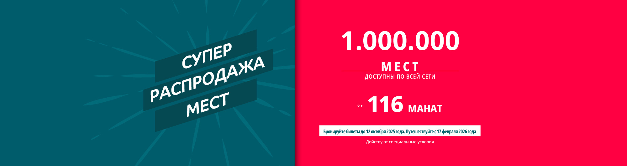 Супер распродажа билетов возвращается с 1 миллионом мест по всей нашей маршрутной сети, с тарифами на билеты в одну сторону, начиная всего от 116 манат. Выбирайте места и бронируйте прямо сейчас.