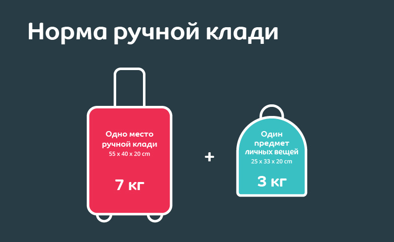 Общая норма провоза ручной клади составляет 7 кг, плюс дополнительно 3 кг для личной вещи. Это включает вашу ручную кладь, личную вещь и любые покупки из duty free: