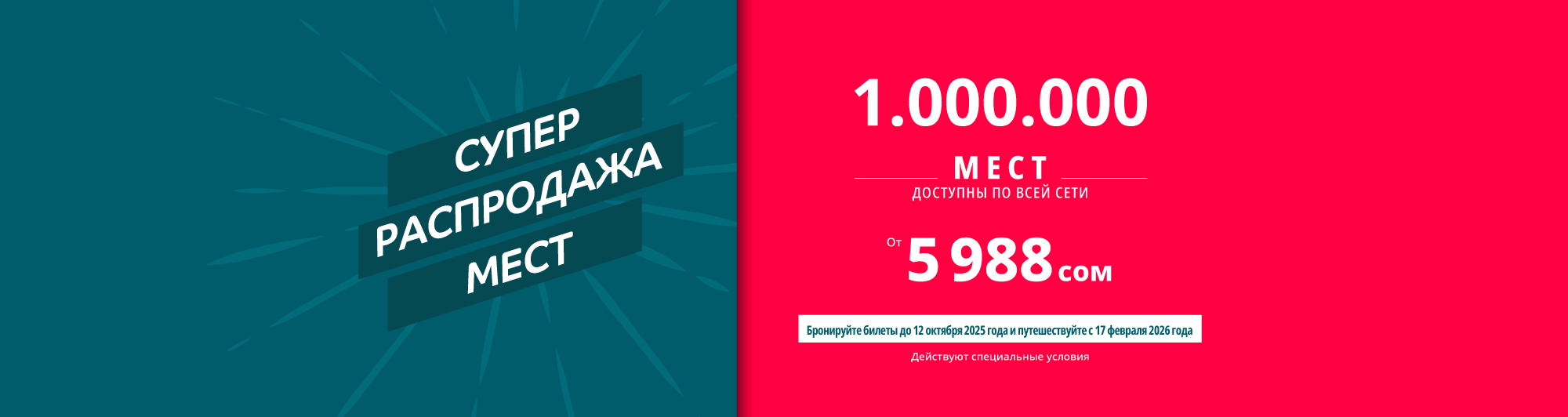 Супер распродажа билетов возвращается с 1 миллионом мест по всей нашей маршрутной сети, с тарифами на билеты в одну сторону, начиная всего от 5988 KGS. Выбирайте места и бронируйте прямо сейчас.
