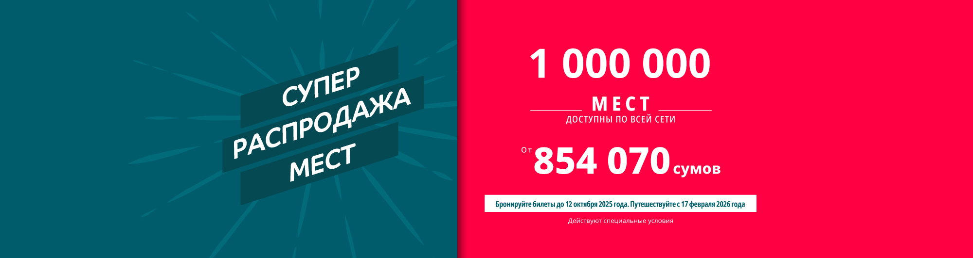 Супер распродажа билетов возвращается с 1 миллионом мест по всей нашей маршрутной сети, с тарифами на билеты в одну сторону, начиная всего от 854 070 сумов. Выбирайте места и бронируйте прямо сейчас.