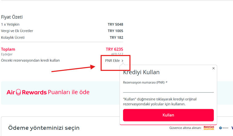 2. Ödeme sayfasında, önceki rezervasyondan kredinizi kullanmak için alt bölümdeki “PNR Ekle” seçeneğini seçin.